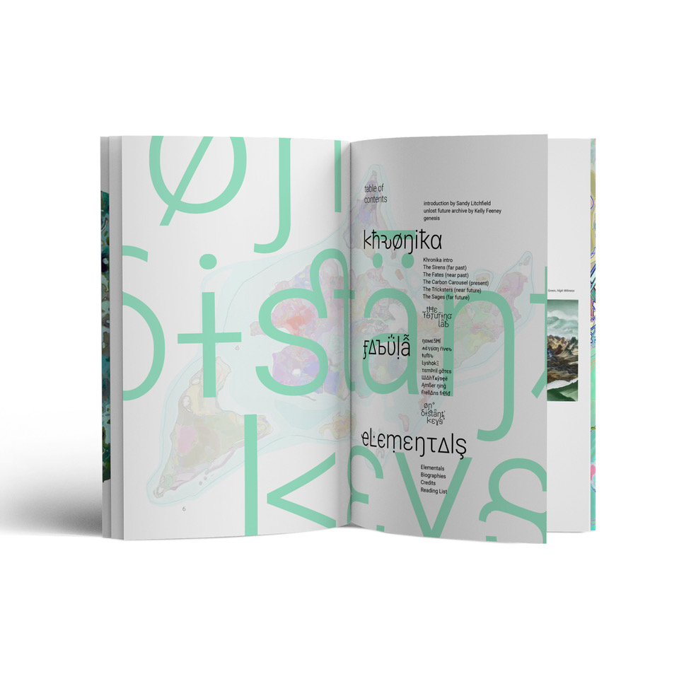 The On Distant Keys catalog is an 88-page, full-color publication produced in a limited edition of 100 copies. Designed collaboratively by Jan Šabach, Sandy Litchfield, and research student Bella Donovan, the publication documents two interconnected exhibitions: The Futuring Lab (2023) and Y3K: On Distant Keys (2024). Together, these projects explored speculative design, ecological imagination, and the evolving relationship between art, science, and place. The catalog serves both as a record of these interdisciplinary experiments and as a prototype for the forthcoming book Y3K: Ondacka, a larger project envisioning a sentient archipelago in the year 3000.