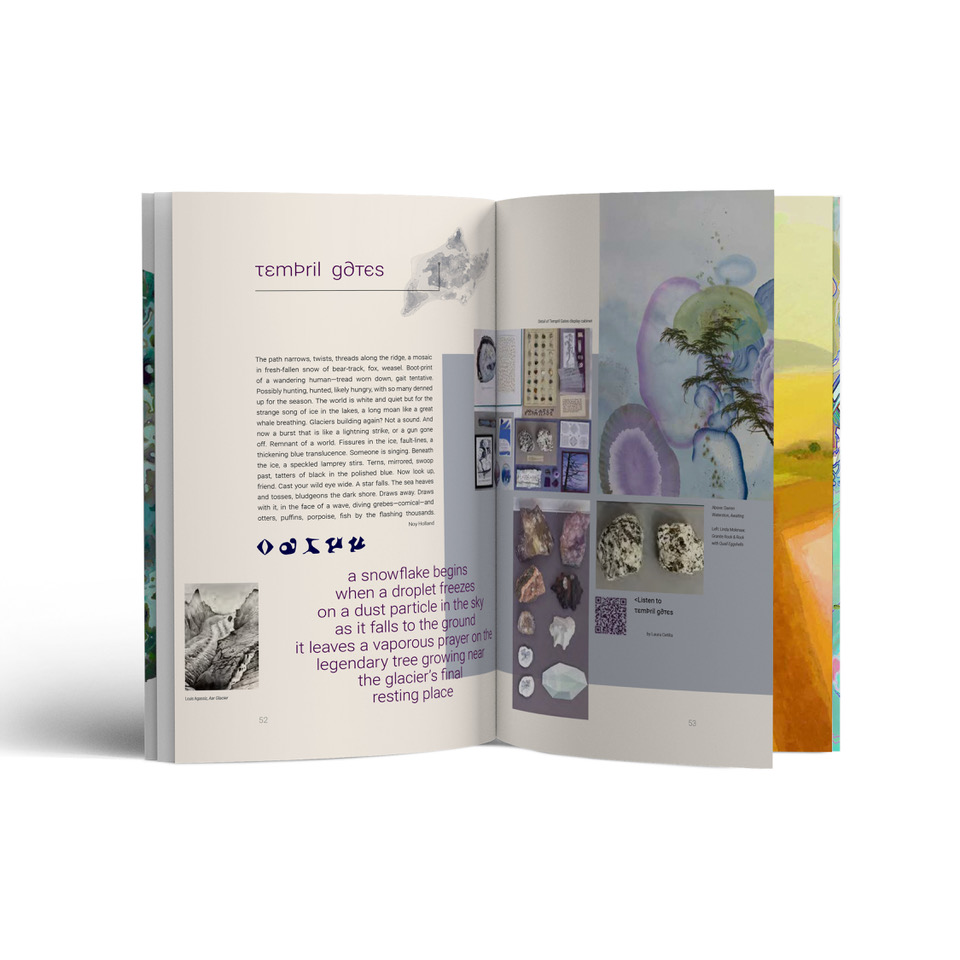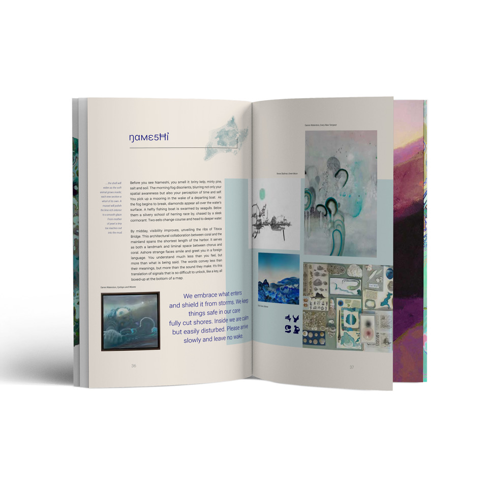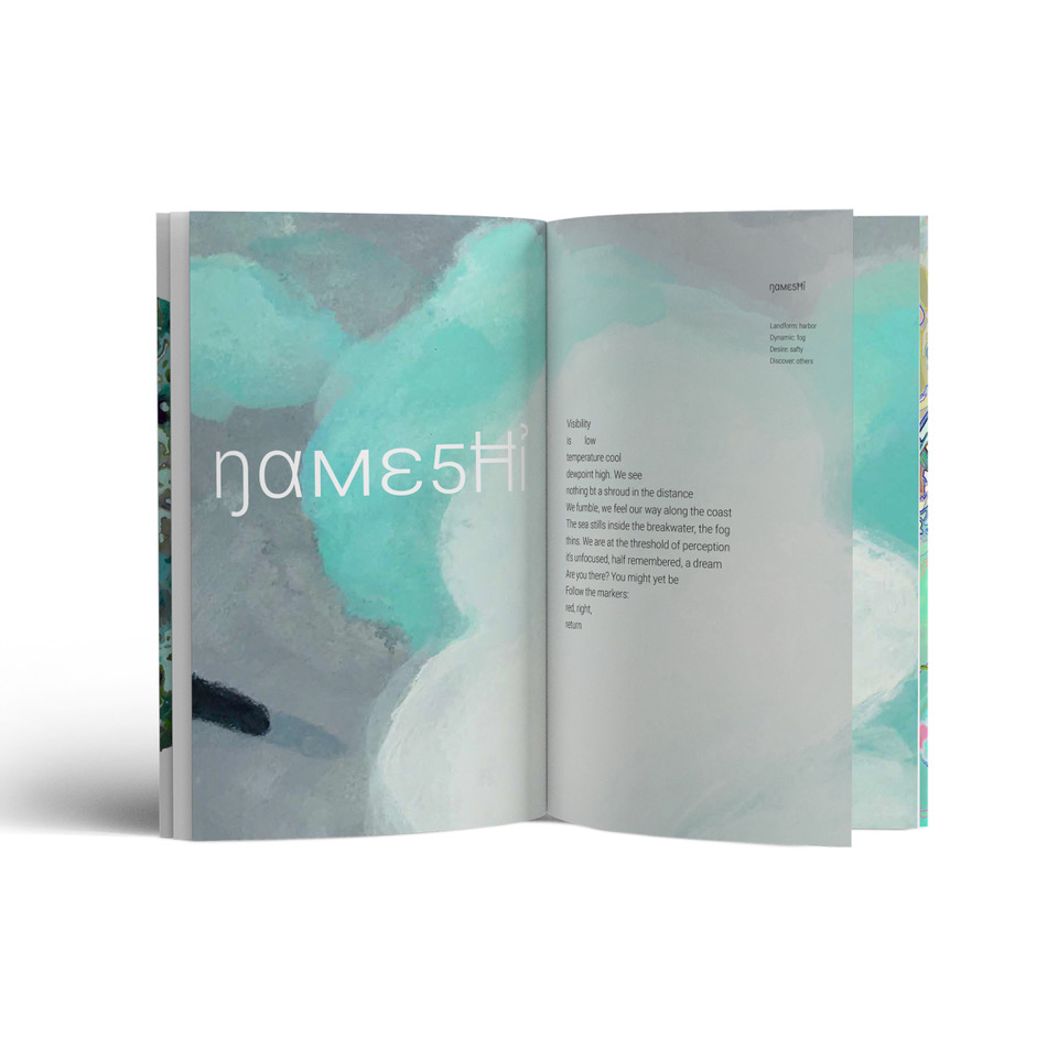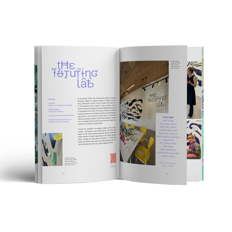 The design merges clarity with experimentation: grids dissolve into organic textures, and text flows amid images like tide pools of thought. The catalog invites readers to engage with speculative worlds where the boundaries between research, storytelling, art, and design become porous, suggesting that the act of imagining the future is itself a vital ecological practice.